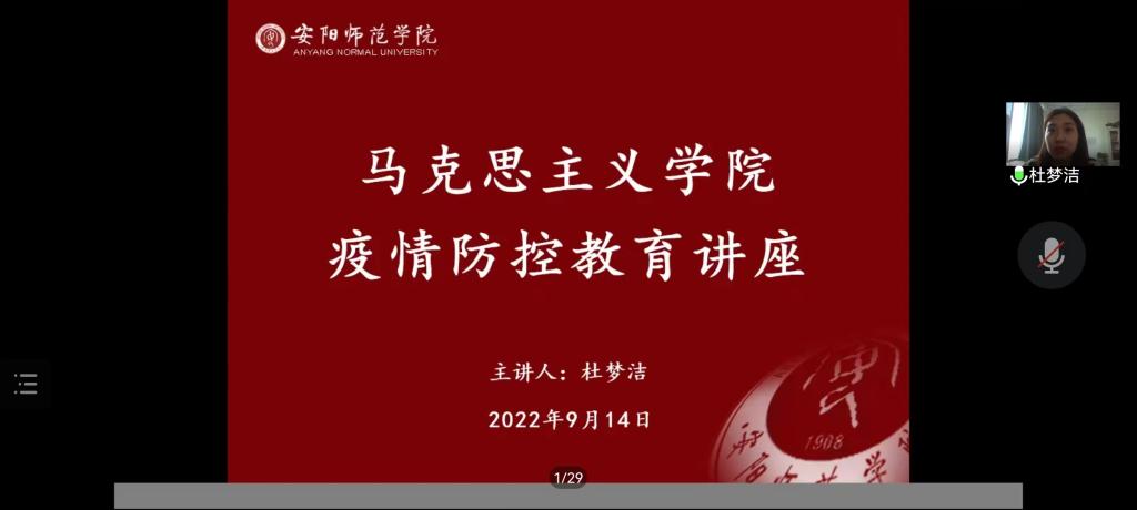 为进一步增强我院新生疫情防控意识,保障秋季开学安全,9月14日,我院于线上召开新生疫情防控教育讲座,我院2022级辅导员杜梦洁作为主讲人出席本次讲座,全体2022级新生参加讲座。