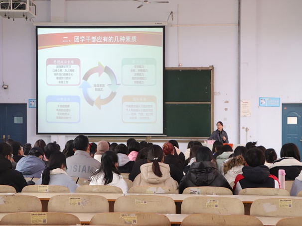 王海霞从“团学干部的角色定位”、“团学干部应有的几种素质”、“心理学视角下团学干部的成长路径”三方面,对团学干部应具备的素质和实现路径做了深入阐述和解读。她指出,团学干部作为学院与广大同学之间沟通交流的纽带和桥梁,是学校学生管理系统的重要组成部分,是实现学生自我教育、自我管理和自我服务的主要力量。她结合心理学理论和自身经历,从“态度决定高度”、“细节决定成败”、“身教胜于言传”、“敢挑战善竞争”、“会沟通善合作”、“懂激励会反馈”六个方面,讲授了提升工作能力和效果的具体方法。