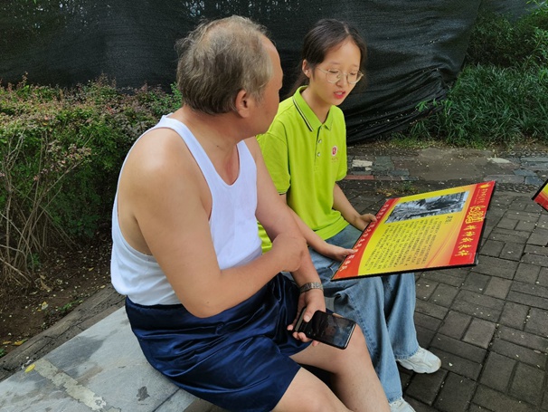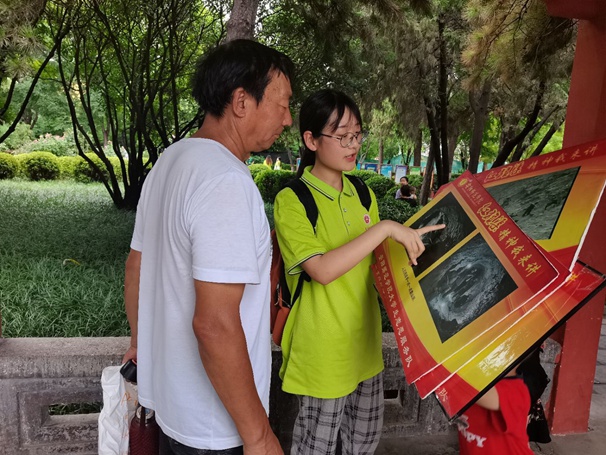 早晨的三角湖公园景色宜人,空气清新,吸引许多市民来到这里健身、游玩。志愿者们一到这里就被这里的景色所吸引。随后,志愿者们迈着青春的步伐走向正在健身的老人,向他们道红旗渠精神,讲红旗渠故事,老人们停下了步伐,静静的倾听志愿者们讲述那段艰难岁月。公园里随处可见志愿者们的影子,湖边、凉亭内、大树下,他们充满激情地宣讲着林县人民在艰难的施工条件下,奋战于太行山悬崖绝壁之上,靠自力更生、艰苦奋斗的精神逢山凿洞、遇沟架桥、排除万难,坚持苦干十余载,最终引得漳河清泉的伟大壮举。