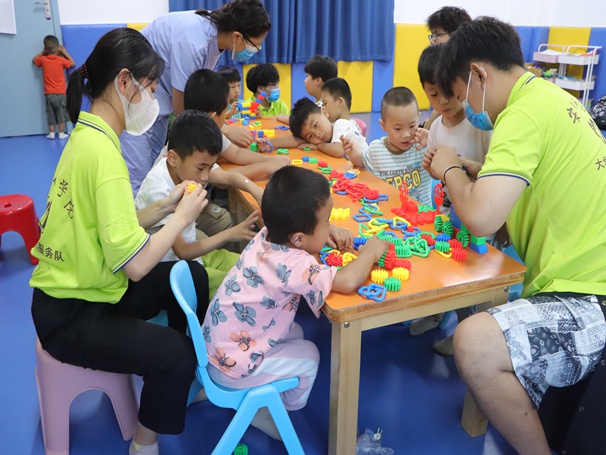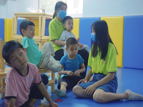 在晨星康复医院的孩子们大多数患有自闭症,具体表现为不爱说话、具有语言障碍、无眼神交流、不与他人互动、喜欢独处等,虽然小朋友们只偶尔与志愿者们进行词句不清的表达,但志愿者们仍然用独特的方式热心地看护、鼓励夸赞小朋友,带小朋友们一起做手工、搭积木。