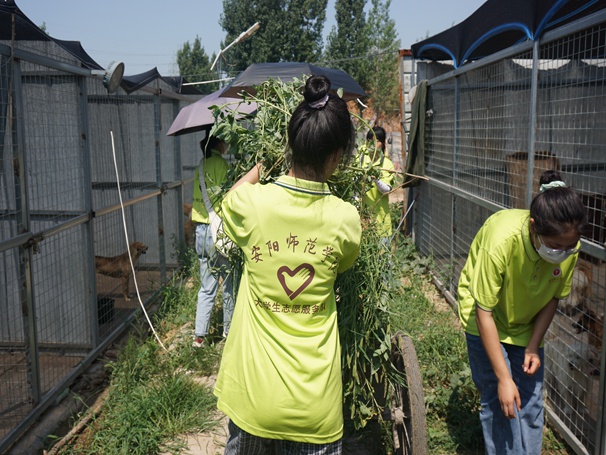团队成员们事先准备好狗粮,在专业人员看护下为流浪狗们进行投喂,并进行一些清扫活动。志愿队男生们还跟着工作人员一起割草,清理狗舍附近的杂草以便日常喂养、看护,割下来的草由其他成员搬运至羊圈喂羊,进行循环利用。烈日炎炎下,团队成员们个个汗流浃背,割草的同学尤其辛苦,但因为自己的行动能为基地提供一些帮助,顿时心里满足。