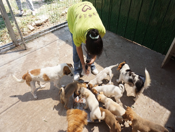 该基地收养了八百多只流浪狗,平均每个狗舍里有八九只狗,狗舍成排坐落在偏僻的地方,看护人员少之又少。由于资金有限加之数量庞大,基础设施匮乏,正常的运营很难维持下去。志愿队队员们可以深切体会到,一上午的劳作就已经让他们疲惫不堪,而这里的工作人员夜以继日的守护在这里,亲切地呼唤着狗的名字,皮肤被晒得黝黑也全然不顾,同时靠着养鸭、羊来获得一部分资金来源。