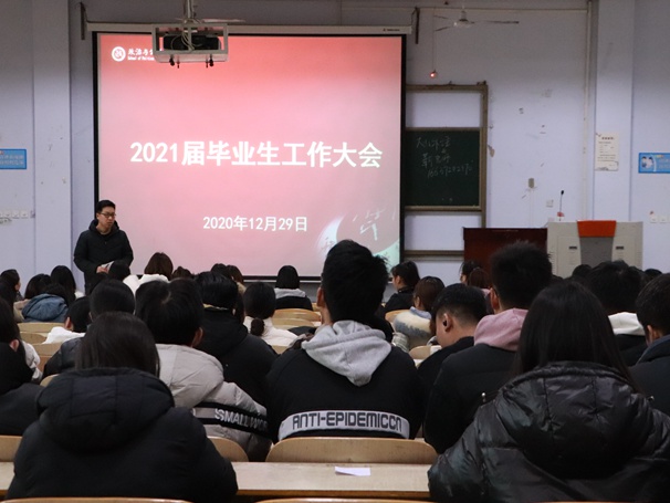 12月29日下午,我院于和展阶梯201成功举办2021届毕业生工作大会,部署下一阶段学生就业工作。我院党委副书记王海霞、学工办主任王国辉、分团委负责人齐斌尧、19级辅导员王素静、张红星老师出席本次会议,17级辅导员黄琳琳老师主持会议,全体17级准毕业生到场参加。