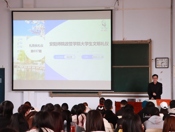 11月28日下午,我院于和展阶梯302开展以“团学干部应具备的礼仪知识”为主题的团学骨干培训班暨第二十一期业余团校培训讲座,本次讲座特邀商学院杨如意老师主讲,我院分团委负责人黄琳琳出席,分团委、学生会全体成员及19、20级全体班委参与本次讲座。