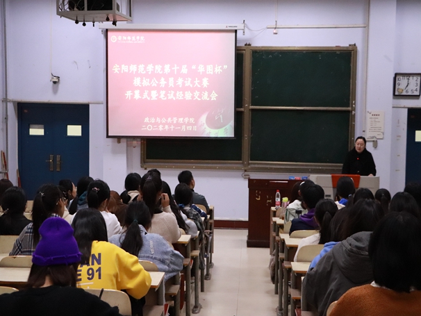 为让广大同学了解公务员招考过程、提高学生素质拓展能力。11月4日晚,我院于和展阶梯203举办第十届“华图杯”模拟公务员考试大赛开幕式暨笔试经验交流会。我院分团委负责人黄琳琳老师、华图教育李宗伟老师出席,全体参赛人员参加。