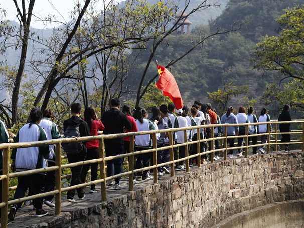 之后全体新生重走红旗渠至青年洞,实地感受了红旗渠修筑时的恶劣地质条件和林县人民逢山凿洞、遇沟架桥,排除万难,引得漳河清泉的伟大壮举,大家切身体会到了当年林县人民不惧生死、“排除万难,敢叫日月换新天”的英勇气概和迎难而上的斗争精神。在青年洞前,2019级5个团支部在团支书的带领下,面对鲜红的团旗庄严宣誓,重温入团誓词,坚定了作为一名共青团员的精神追求和为党的事业奋斗终身的信仰。