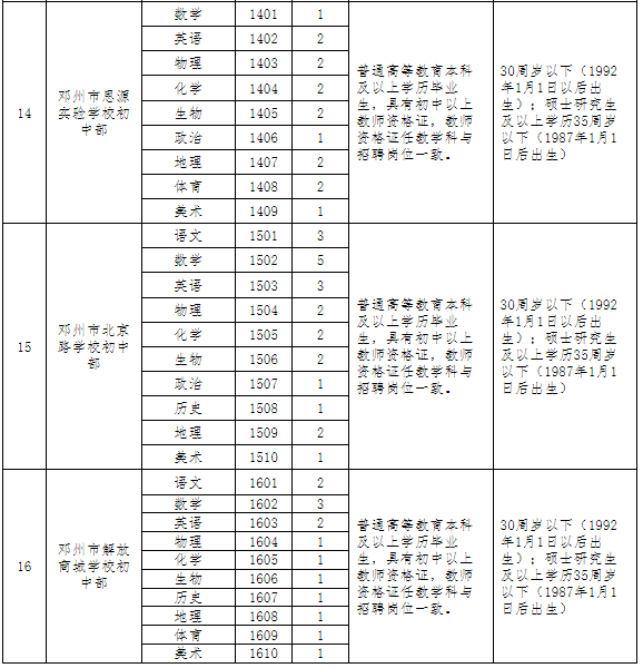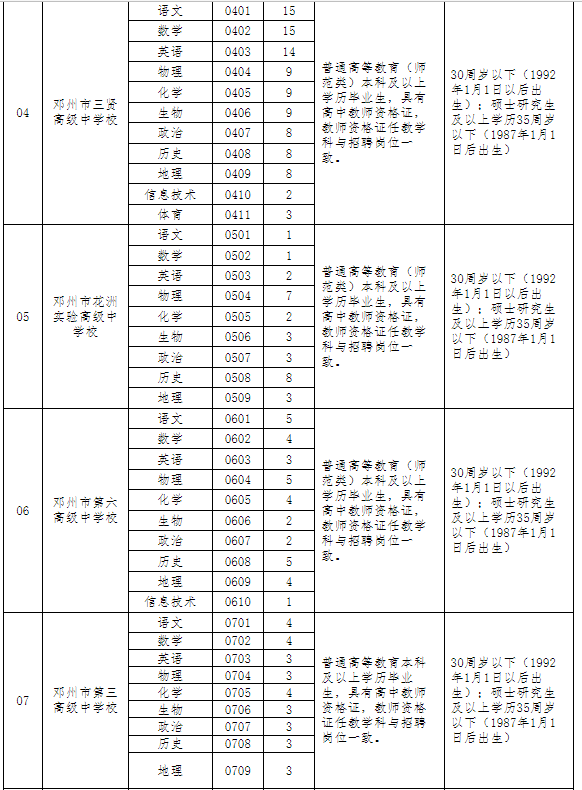学历、专业及教师资格条件详见《邓州市2022年公开引进高中及初中急需紧缺教师职位表》(附表)。