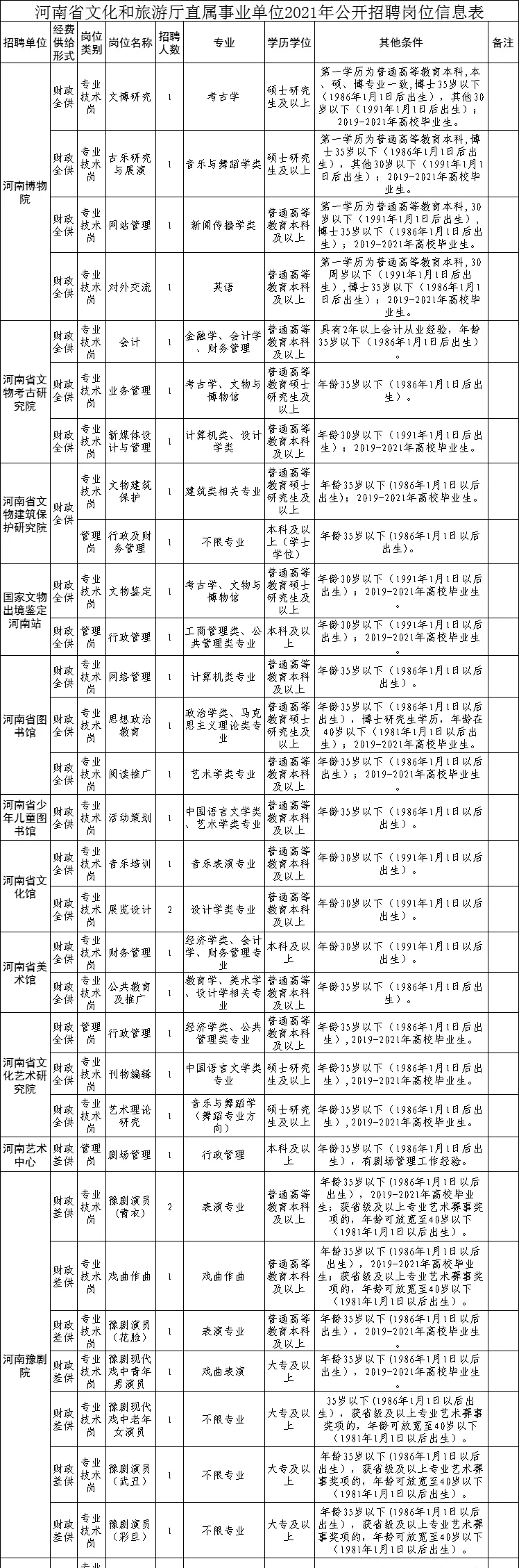招聘信息于2021年11月24日至2021年12月2日在河南省人力资源社会保障厅网站(http://hrss.henan.gov.cn)、河南省文化和旅游厅网站(https://hct.henan.gov.cn)、河南省人事人才考试测评服务中心(http://www.hr.hnsrsks.com.cn/category/hnwl/)同时发布,各单位招聘岗位详见附件。
