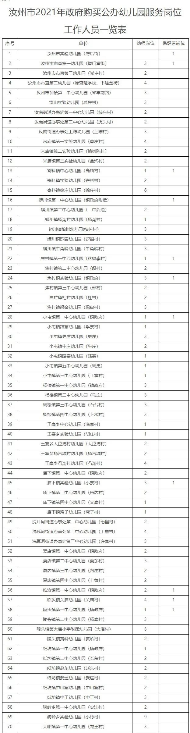 根据《河南省人民政府大力发展学前教育的意见》(豫政〔2011〕48号)《河南省人民政府关于全面加强教师队伍建设的意见》(豫政〔2013〕59号)《汝州市人民政府向社会力量购买公办幼儿园服务岗位实施方案(试行)》(汝政办〔2014〕97号)精神,经研究,决定面向社会公开招聘政府购买公办幼儿园服务岗位工作人员。为扎实做好招聘工作,公告如下。