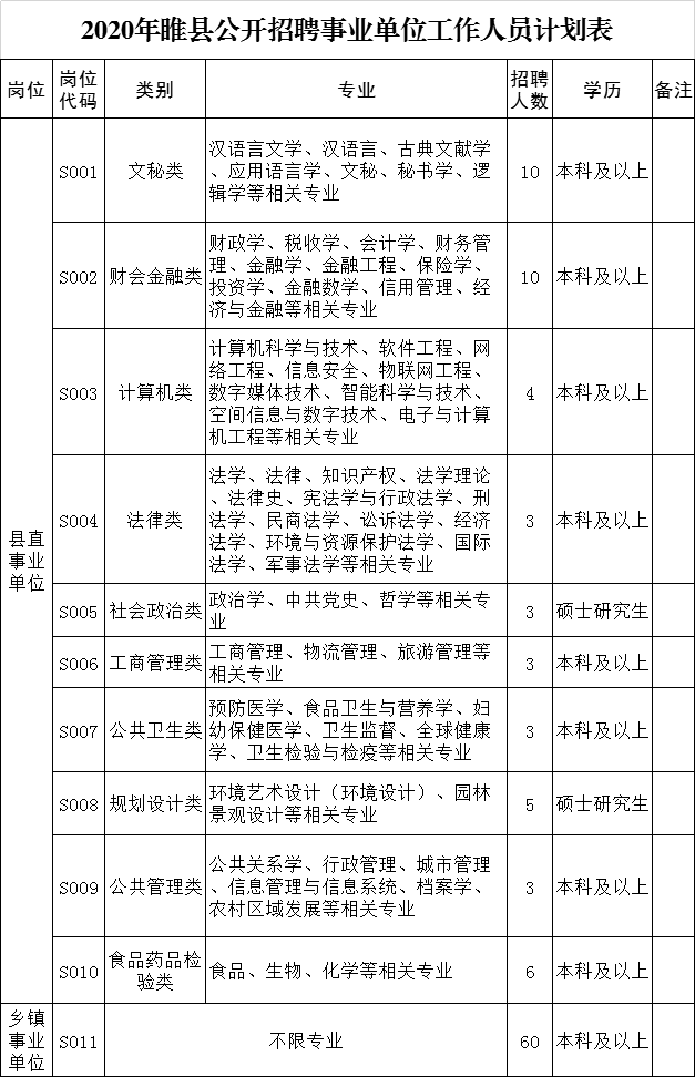 本次计划招聘乡镇事业单位工作人员60名,县直事业单位工作人员50名,具体岗位、招聘人数详见附件(2020年睢县公开招聘事业单位工作人员计划表)。