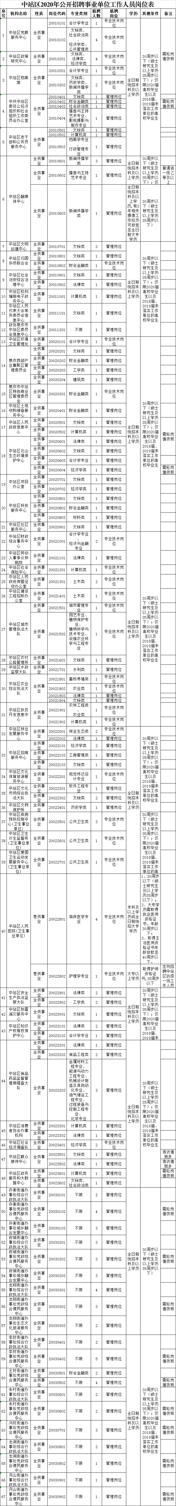 1、中站区2020年公开招聘事业单位工作人员岗位表