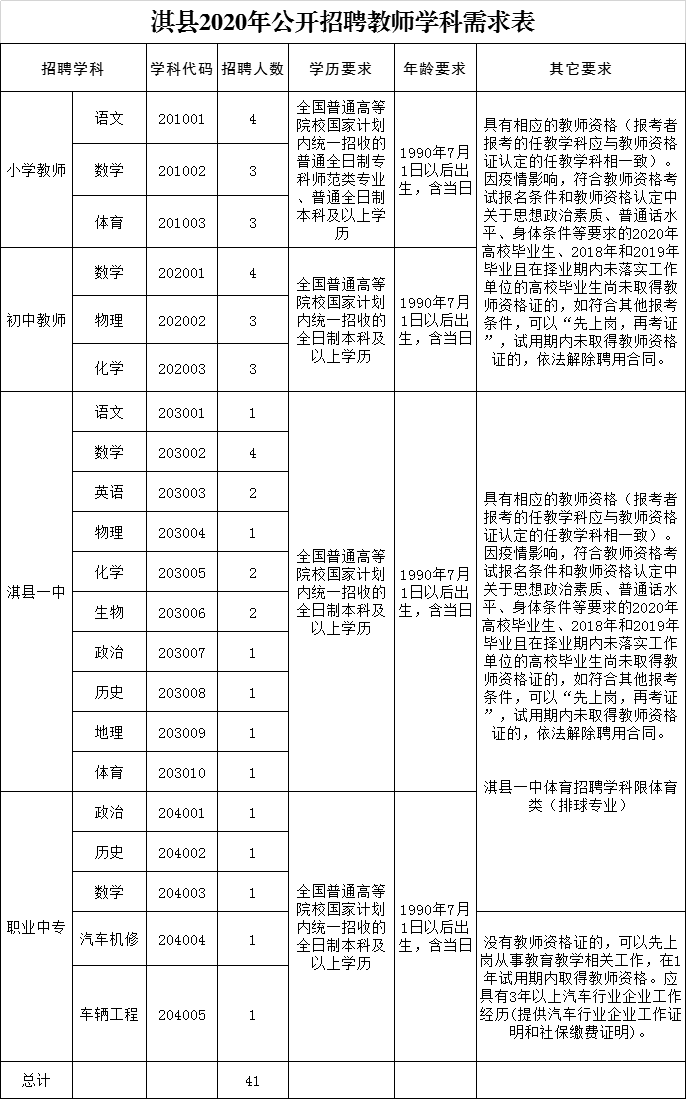 本次共招聘教师41名,具体招聘学科及人数详见《淇县2020年公开招聘教师学科需求表》(附件1)。