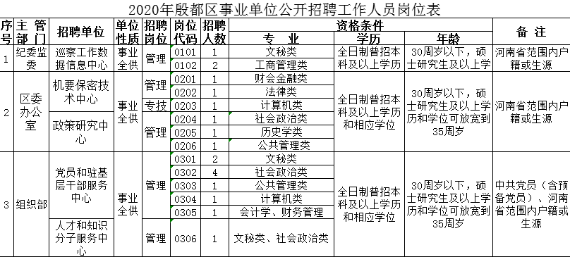 具体招聘单位、岗位、专业、人数、资格条件等详见《2020年殷都区事业单位公开招聘工作人员岗位表》(附件1),《2020年殷都区事业单位引进优秀人才岗位表》(附件2),专业或专业类别参考《河南省考试录用公务员专业设置指导目录》、《教育部研究生专业目录》。